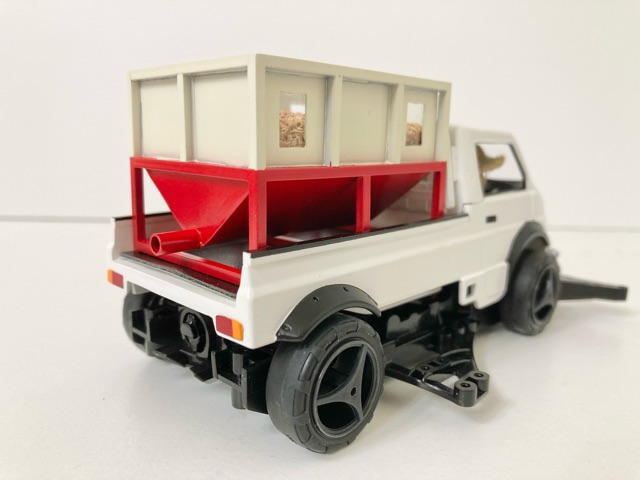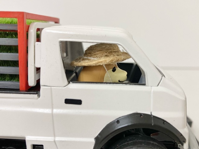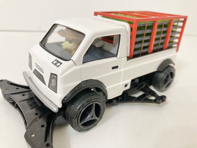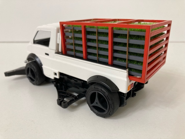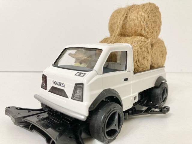 軽トラ。それは、わが国の主食の生産を支えている重要インフラ。 K4ギャンボーのキャビンを短く加工し、標準的な長さのデッキとしたうえで鳥居を追加。 その荷台には、それぞれフルスクラッチした田植えに使う「苗運搬ラック」、稲刈り用「籾コンテナ」、刈取り後の「稲わらロール」を搭載可能。 運転席には、手作りの麦わら帽子をかぶったミニ四ドッグさんにおさまってもらいました。