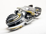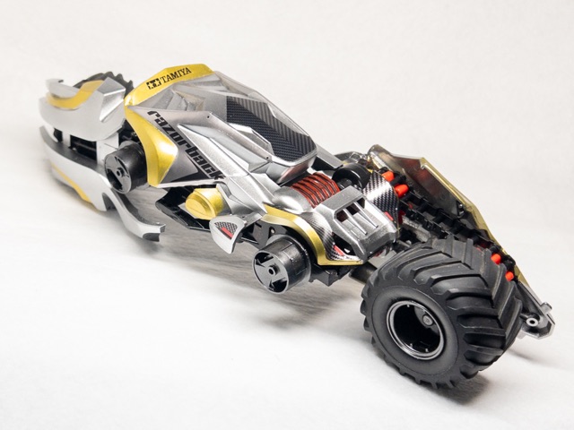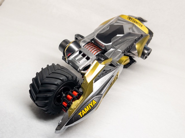 レイザーバックな奴ら 出品中 RAZOR BIKEにしようと思ったけど意味が自転車になっちゃうので…… 駆動方式、工作手順、使用パーツなどずっと妄想しつつ11/16から作り始められるかと思ったら まさかの体調不良 そのまま尽未来祭 結局11月末週の火曜日からしか時間が取れず3日間21時間で完成 迷いなく力業で不都合を無視して組み上げました 塗装は良い感じ はみ出る前提で水性ファインゴールド使ったのにこういう時ばかりマスキングうまくいく 駆動は前輪のみ回って、横のスプロケットからチェーン駆動で動きます 動くはずです 動くといいな 怖くて1.5Vノマモですら試走させるの躊躇うレベル Vガンダムのハードポイント的な意匠に見せかけたワンウェイホイールがお気に入り