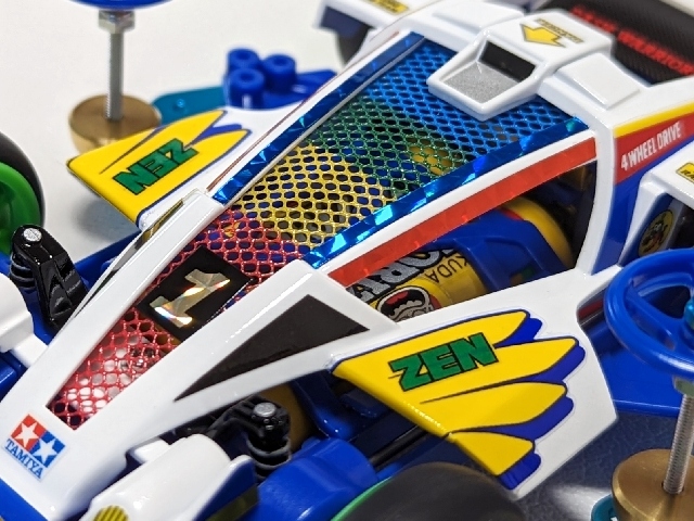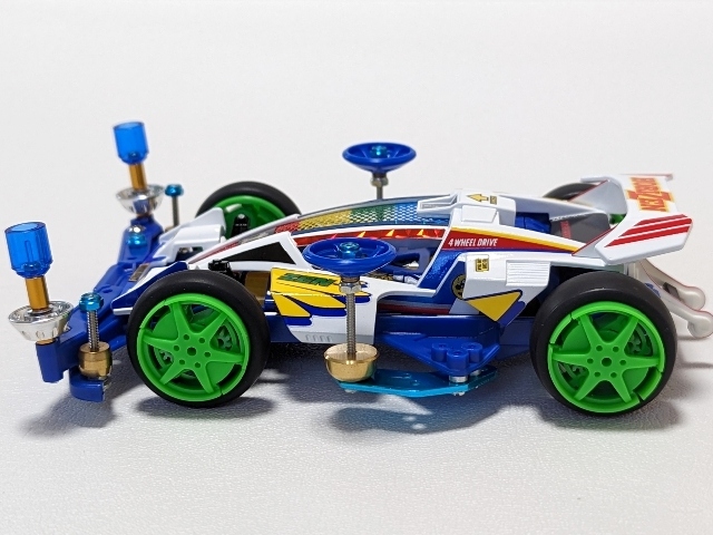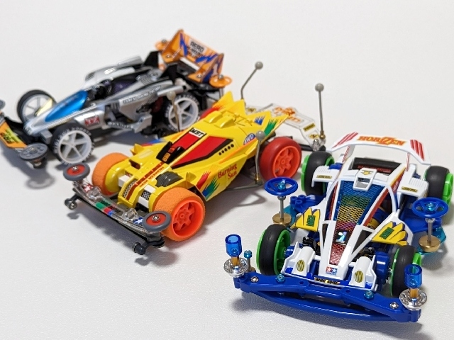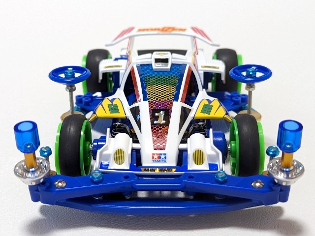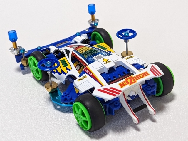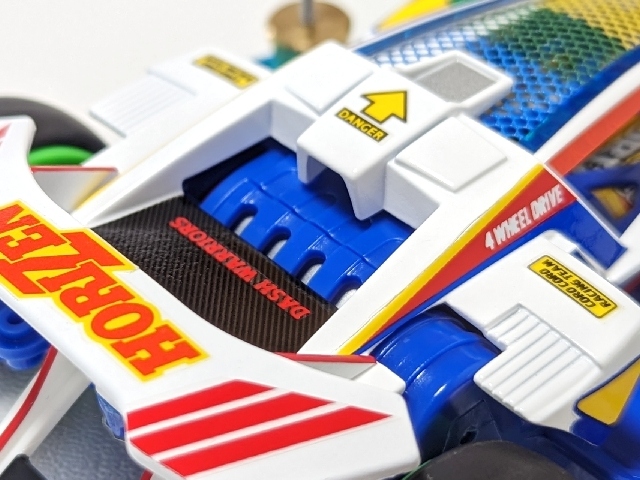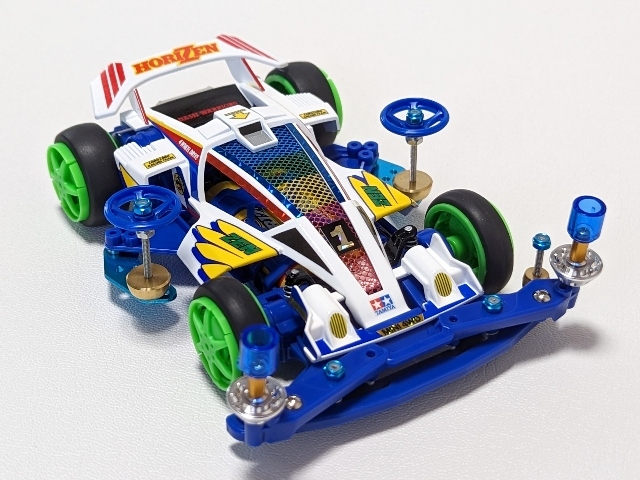 キラリ輝くゼッケンNo.1! 頂点狙う新生ホライゼンがスピードフラッパーに挑戦だ。直進性抜群のSXXシャーシにF荷重を意識したセッティングでヘアピンカーブもバッチリ決まるぞ。 レーシーな色合いが前マシンらしいね。