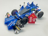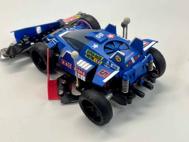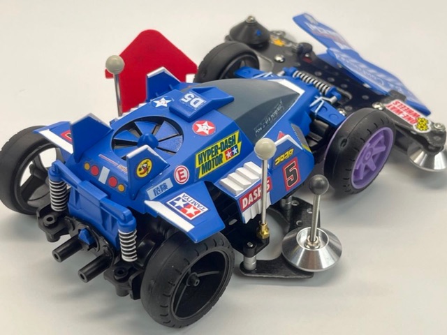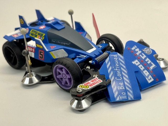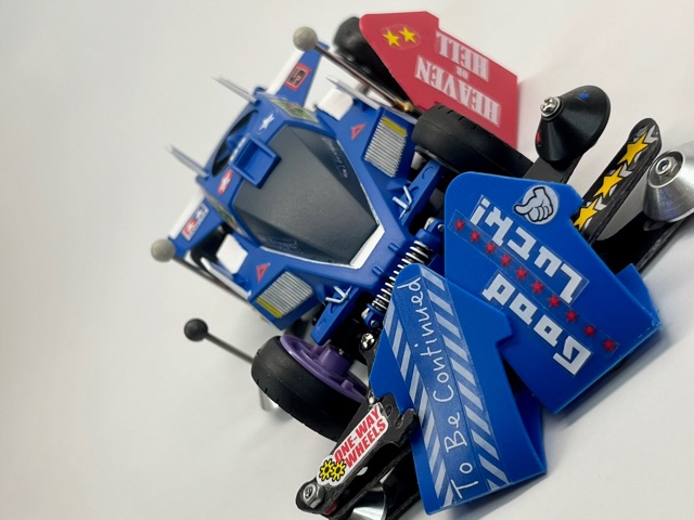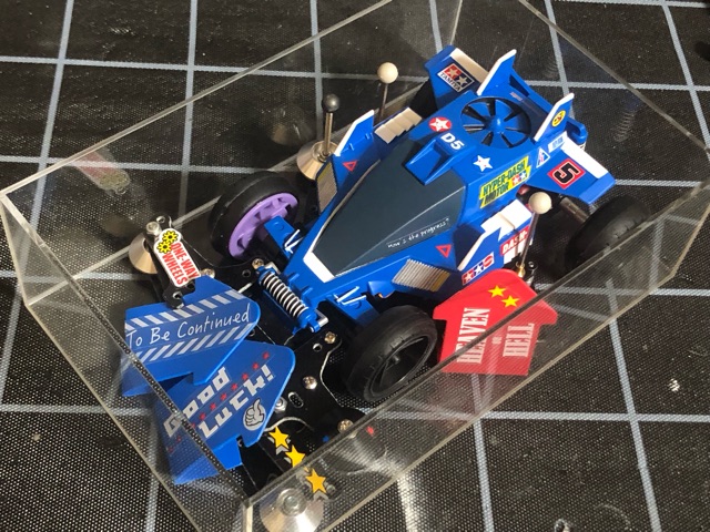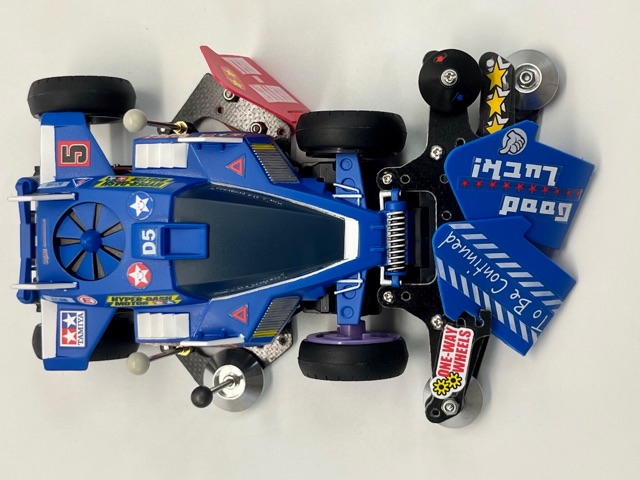 D5とは(DASH5 Dancing Doll Dynamic Drive)の略である。 ワンウェイホイール逆履きにローフリクションを装備してドリフト走行を可能にしたバトルマシンだ! これが令和のクラッシュレスリングマシンだ‼️ ミニ四駆の公式レギュレーション内で回転するギミックを組み込んだマシン。 車高も1ミリ確保し165×105内に抑えてある。 正面からきたマシンをキャッチャーでいなして吹っ飛ばす。サイドポールで横からの攻撃もガードする。カラーは青くしてアメリカンで攻撃的な雰囲気に。 2025/12/19 #絶版コンデレC アタック部門 制作