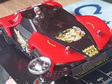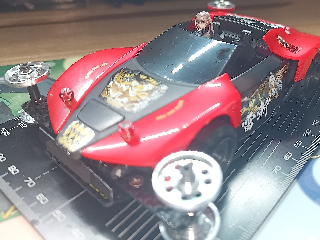 サイバーパンク的な感じで痛車仕様 ボディがカッコいいのでそのまま活かしたい&車高が低くマスダンを車内に仕込めないためボディ提灯にして制震だけ確保 MEシャーシのしなり具合がタミヤの回答でベストなんだろうと信じてリジットバンパー