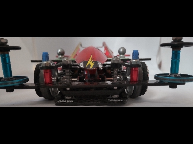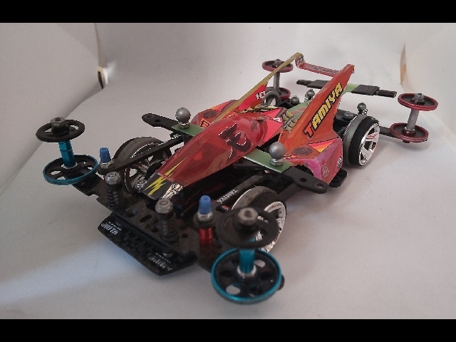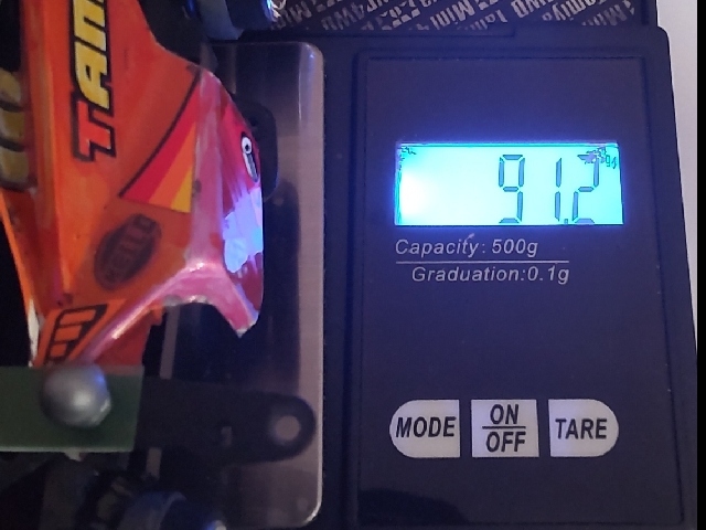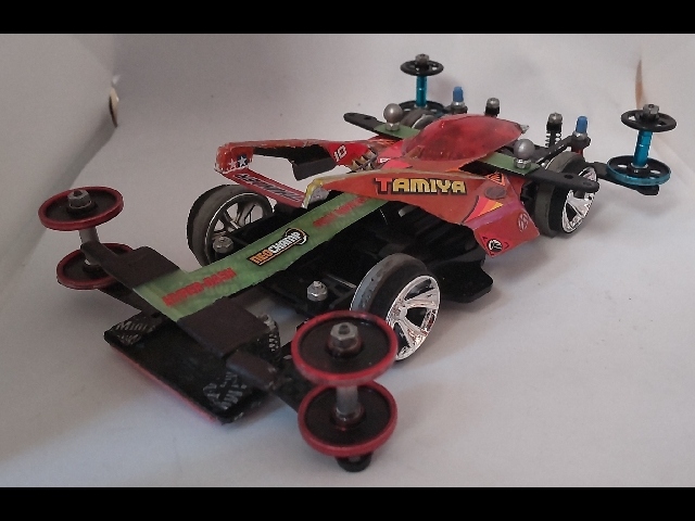 MEをつくるにあたって余り物でできそうだったからと組んでみたもの。レブ2と3.5:1でタイヤ径は25くらい?で、電池抜き91.2g。まあ標準的 今のところフロントに立てた二本の根っこがすぐ白んできそうなのとフロント提灯がすぐずれそうなのが心配事。まあシャーシ以外余り物だから…理論でなんとかする予定