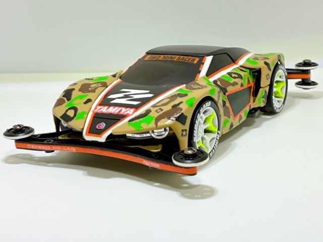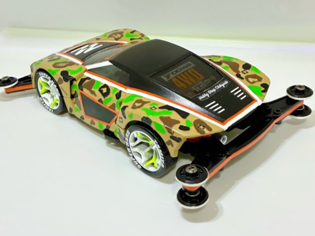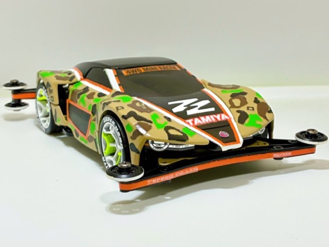 ライザンコンデレ エントリー中 リバリー部門 迷彩柄にカラーリング✨渋くなり過ぎない配色を意識しました☝️タミヤロゴマークの『☆』を密かに忍ばせています🤫迷彩柄を潰さないようにクリアボディ部分を活かし、敢えて内側メインでステッカーを施工。チラリズム👀💕