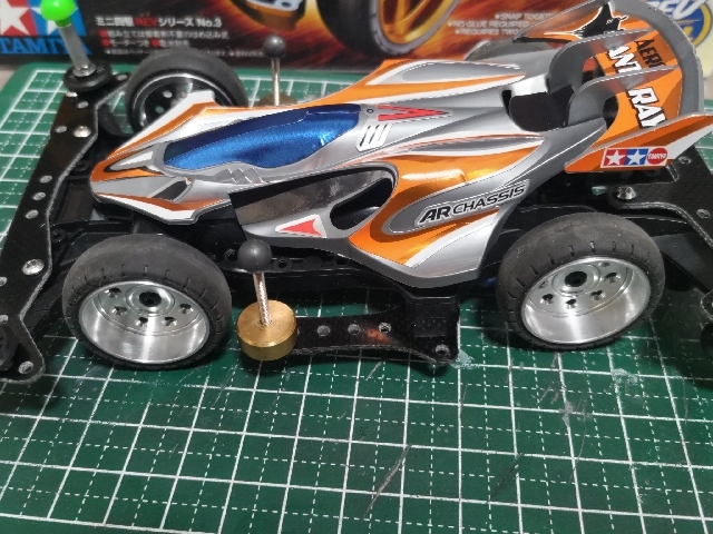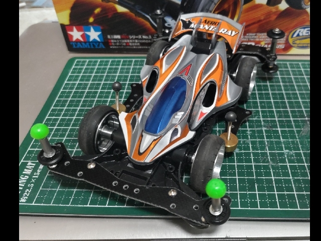 前回のエアロマンタレイにファーストトライ風にパーツを取り付けました!AR用サイドマスダンパーも付けてモーターもアトミにしました!┗(°∀°)┛ そしてアルミホイールを今回は採用してみました!足回りを重くする事で低重心化に期待してみます!(๑•̀ㅂ•́)و✧ 持ってみるとなかなか重く電池込みで160gありました。でも意外と走りは良かったです┗(°∀°)┛ 今回は大径を使ってみたので次は中経のアルミホイールを使ってみます。タイヤが小さければその分重心が下がります。プラボディだとどうしても重心が上がりがちなのでそれをアルミホイールで対応する形ですね マシンが遅いとイマイチ効果がわかりづらいのでローラーも軸受けも全部ベアリングにしてみます。フロントアンダーガードとARブレーキセットも付けて簡易なセッティングで走らせてみます!(๑•̀ㅂ•́)و✧ 調子が良かったらモーターをハイパーに変更します。ハイパーでも問題無かったらスプリントでも大丈夫………なはず(๑•̀ㅂ•́)و✧ あとパワダが売ってたので買いました。正直パワダはトルクが過剰なので飛びやすいのでいらないですが一応www(°∀。)
