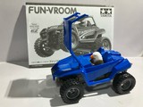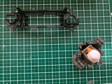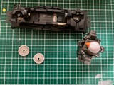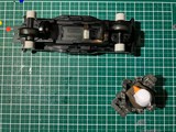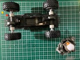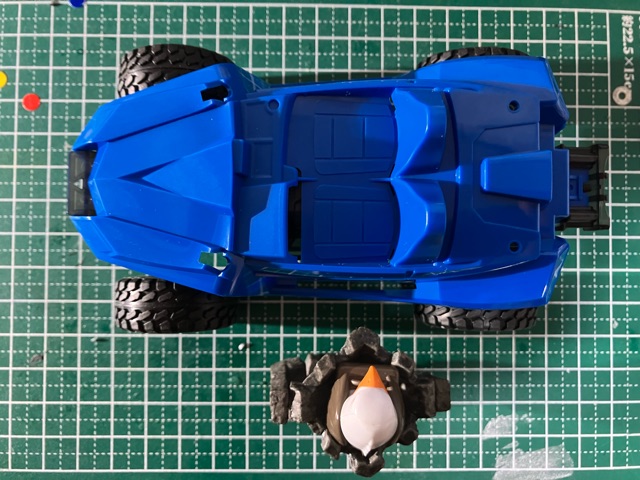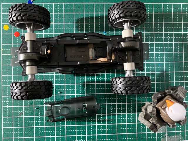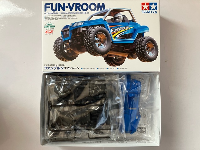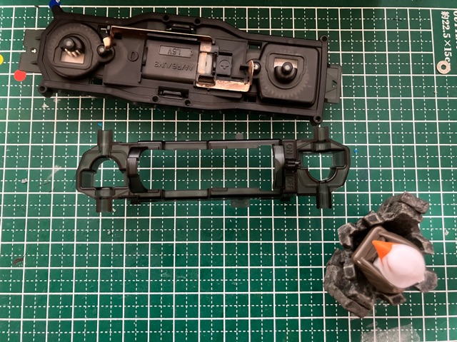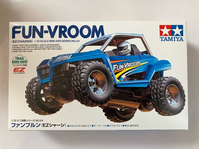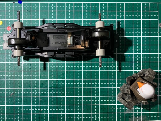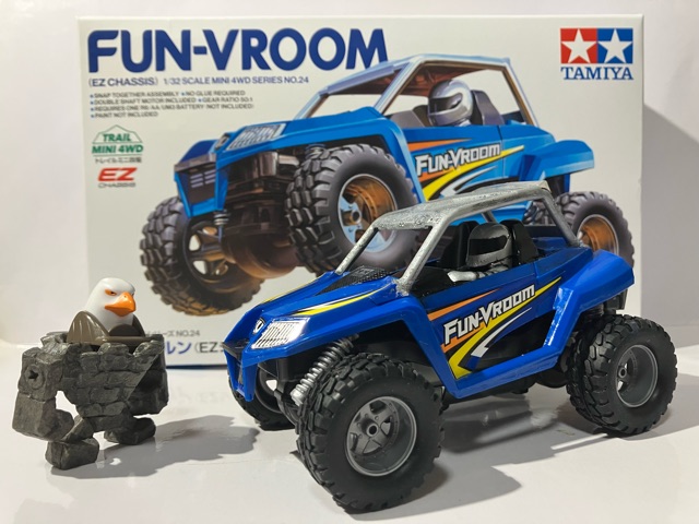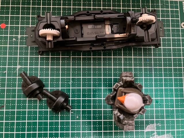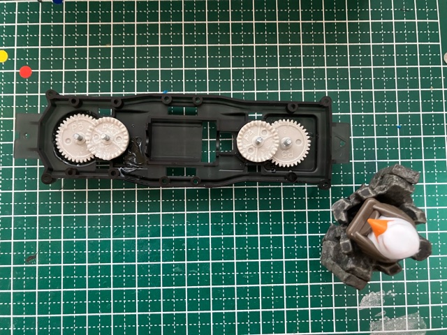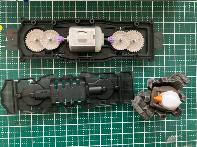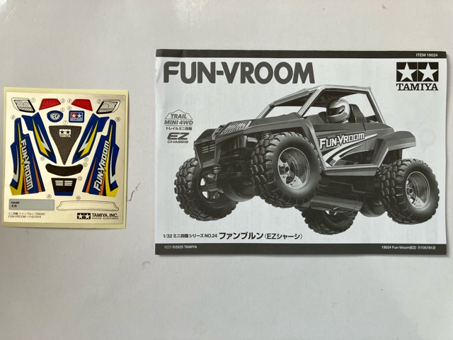 ※黄色の共通取扱い説明書は割愛。 トレイルミニ四駆 ファンブルン制作記 直線型ギアシャフト(×4も)と、50:1のギアは数が多いな。 クラウンギアとピニオンが一体化した様なギアと、スパーギアとピニオンが一体化した様なギア。 クラウンとシャフト用の六角がついてる様なギアで構成されてます。 ギア穴、シャフト穴が半分で、ベアリングというよりPOMのキャップで半分のパーツ同士固定してます。 足回り(ブロックタイヤ、中シャフト、専用ホイール)だけが、ミニ四駆シリーズと共通で後は別物。 電池も一本だし。 (これは物価高だから少し嬉しい。でも、トレイル系もだけど、一本のダンガンレーサーとか復活して欲しい。) ほぼ一つの箱だったミニ四駆シリーズのシャーシ、プロペラシャフトにギア、バネ等通してヤキトリ串作らされる事もないし、シャフト穴があるだけで、ベアリング入れたり、キャップ噛ましたりはないシャーシ…とは大違い。 ボディも80年代〜90年代のRV実車系ではなく、 コミカルバギーていった感じですね。 どちらかというと、ビッグウィグやグラホの仲間みたいな感じ。 何だかホークのオッチャンも乗りたがりますね。 この子が登場した日記が、2025/05/24なので5ヵ月程『詰み』してた様…。 体調崩しやすかったり、物価ばかり上がり調子だったり、モタモタしてる間に『くまモンver.』の方が出ちゃうゾ。