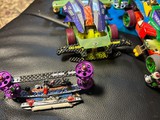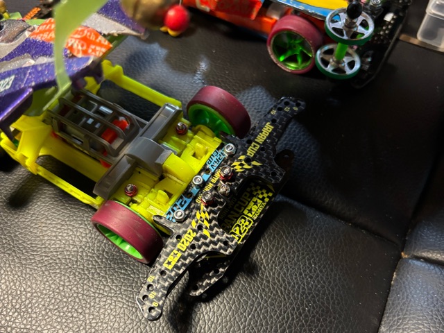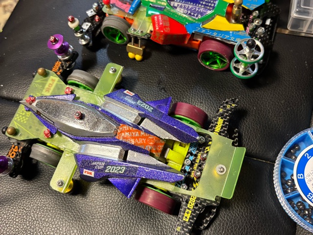 ダイナホークさん ) くらすぞコラァ!(ボキッ!) 妖精さん ) 痛すぎるんじゃコラァ!(べちんっ!) わたくし ) やっぱりブレーキを白から青に変えたらまずかったかね。(ふらふらしながら) よ ) だから申し上げておりましたのに。 わ ) 変えてみたくなったので、まぁ、仕方ないよ。 よ ) おかげで全身打撲ですわよ。ダイナホークさんも一緒に。 わ ) いやぁ、ひどかったね。結局、電池1セットしか走ってないんだもの。しかも家に工具類一式忘れてるし。 よ ) で、今日のトピックはなんですか? わ ) ダイナホークさんのリヤーセクションを君に揃えて整備性の向上と、おそらくそれで狙える近代化。 よ ) なるほど、とはいえ全くの同一ではないのでしょう? わ ) そうだね、まず、ブレーキプレートはカーボン2023だよ。 よ ) え?わたくしFRPですよ? わ ) 取付け基部はいつかの水色カーボン、ローラーステーは2017と2020の2枚重ねになった。 よ ) なんか、かなりの絢爛豪奢では?在庫は大丈夫なんですの? わ ) まぁ、いつまでも残ると在庫は不良在庫と呼ばれるからね。たまにはパーっといこうか。 よ ) それでよろしいのでしたら止めませんけれど。 わ ) たぶん大丈夫だよ、足りなくなるほど使ってないくせに買い足したりするから。とは言っても、ローラーは元のパープルを利用することにするよ。さすがに無駄にしたくないし。 よ ) あんたに多少でも理性があって良かったと思いますわ。 ダ ) …新しいギミック…・:*+.\(( °ω° ))/.:+ わ ) あ、今週の作業はここまでだよ。明日は魚釣りに行くからね。 よ ) ダ ) ……キサマ、この…。ಠ_ಠ