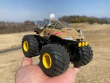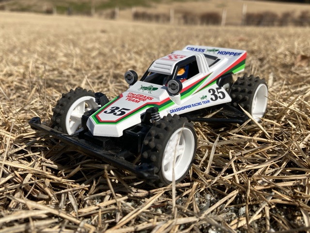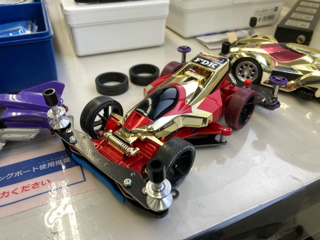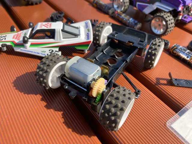 やって来ましたみはらし公園! グラスホッパーはギヤ比6.4:1で運用していましたが、舗装路に出るとやっぱ速すぎ…11.2:1ギヤに替えたいところですが、手持ちがないので仕方なく8.75:1のミディアムギヤに下げてみたものの、それでもまだ速い… ストリートミニ四駆は5:1を使うようですが、私には到底ムリそうです。 久しぶりにワイルドザウルスでも遊びましたが、楽しくて時間が経つのも忘れてついつい長居してしまいました。やっぱり屋外走行は良いですね。 その後はローパーでサーキット走行。前回来た時に試したevoもどきVSシャーシには、金ピカ無加工ボディを搭載してついにB-MAX/ストッククラスにも対応!と言っても、またしても今製作中のボディのピンチヒッターなんですが… さて今回は、リヤローラー下部にフェンス引っかかり対策を施し、パワーダッシュモーター+4.2:1ギヤでトルク重視にしつつ、スピード控えめを狙ったセッティングでいざ発進! …と思ったらやべぇ、むしろ前回より速い!どうやら加速力と大径タイヤの恩恵がいい感じにマッチしたのか? そんな思いをよそに暴れまくるマシン!その一方で着地はなぜかそこそこ良いぞ! 制振の類は一切乗せてませんが、FRPでガチガチに固めたシャーシ・・・もしや、コレがあのノーシステムなのか!? あと、これは私だけなのでしょうか。たかだか1〜2時間程度のサーキット走行で毎回プロペラシャフトのギヤが緩くなり交換してます…