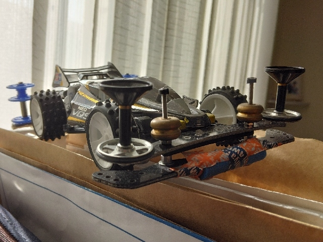 スーパーアバンテJr.ブラックスペシャルの投稿後、松坂屋静岡店で行われたB-MAXタイムアタック大会に出場。走行前に通り雨が降り、屋上で行われたためコースが雨で濡れてしまった。スーパーアバンテを走らせたところ、スリップしてマシンが加速せず空転しながら走っていた。モーターはハイパーダッシュに換えていたが、「おっそい」の一言に尽きなかった。 その後、コースクリーニングカーによって掃除され、再び走れるようになったが、今度はマシンの軽さなど云々で吹っ飛ばされCOしてしまった。軽すぎても駄目なようだが、ここはセッティングでカバーしたい。 帰宅後、本マシンの制作を開始。余っていたVZシャーシとネオVQSを使用し、雨用(屋外用)マシンを作った。 タイヤは雨でのスリップを低減させるため、スパイクタイヤを採用(バレルやオフセットトレッドは接地するところが常に同じなので滑る可能性があった)。ただスパイクタイヤは跳ねやすいためマスダンパーとブレーキでマシンを固めた。ギヤ比はは3.5:1、モーターは取り敢えず余り使わないトルクチューンモーターを採用。フロントローラーがゴムリングなのはコーナーでマシンを落ち着かせるため。 スパイクタイヤはまだ走らせてないため、どのような挙動をするのか楽しみだ。 3枚目:疾走感を出すためわざとぼかしてます。 追記 ボディ交換しました トップあざます。